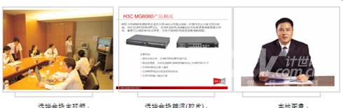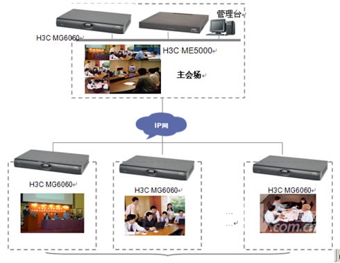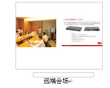 在主會(huì)場(chǎng),分會(huì)場(chǎng)的會(huì)議室配備H3C高清視訊終端MG6060。H3C MG6060終端支持H.263、H.264等視頻編解碼協(xié)議,并采用了專(zhuān)有的視頻前、后處理技術(shù),使得圖像質(zhì)量大大提升,在周?chē)h(huán)境光照較差或者會(huì)場(chǎng)顏色搭配不甚和諧的情況下,仍舊能夠得到清晰、自然的圖像。視頻功能主要特色功能包括動(dòng)態(tài)4CIF高清圖像、H.239雙視頻流傳送、畫(huà)中畫(huà)(PIP)、雙屏顯示、分屏顯示、VGA輸入、VGA輸出、桌面?zhèn)魉、圖像屏蔽、圖像參數(shù)調(diào)整等。有關(guān)H3C