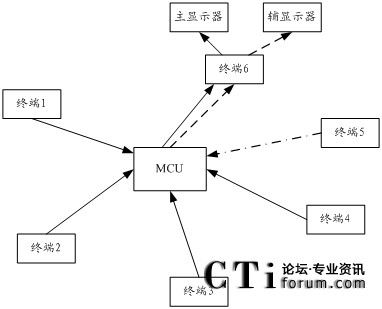 MCU將發(fā)言人所在的終端1的圖像通過主流通道發(fā)給終端6,將終端2、3、4的圖像解碼,并接成具有3個小畫面的單一畫面,編碼后通過輔流通道發(fā)給終端6,終端6將在主顯示器上看到終端1的圖像,在輔顯示器上看到終端2、3、4的圖像。