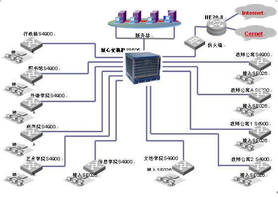 S8505萬兆核心路由交換機(jī)作為整個網(wǎng)絡(luò)的核心,以高密度、大容量的轉(zhuǎn)發(fā)性能為豐富的業(yè)務(wù)提供支持。Quidway? S8505萬兆核心路由交換機(jī)具備178Mpps的處理能力,300G的交換容量,并可以升級到600G;接入采用為教育行業(yè)定制的E026/E050交換機(jī),實(shí)現(xiàn)整網(wǎng)的安全接入的完善的帶寬管理功能。網(wǎng)絡(luò)出口采用NE20-8第五代路由器實(shí)現(xiàn)雙出口,實(shí)現(xiàn)靈活的路由策略。
