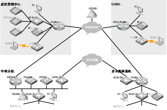 通過在公網(wǎng)部署XE2000語音服務(wù)器實(shí)現(xiàn)IP語音網(wǎng)絡(luò)向廣域網(wǎng)的擴(kuò)展,實(shí)現(xiàn)IP語音無處不在,內(nèi)部電話完全免費(fèi)。公網(wǎng)XE2000與中南分校局域網(wǎng)XE2000配合輕松實(shí)現(xiàn)NAT/FW穿透,無需添置任何其他設(shè)備,對已有NAT/FW設(shè)備影響小。