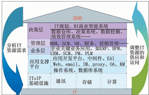 按照華為3Com的構(gòu)想,如果把整個IT系統(tǒng)比做一座房屋,那么整個房屋的地基就是IP網(wǎng)絡(luò),需要基于IP網(wǎng)絡(luò)來構(gòu)建通信、存儲、計算等IT基礎(chǔ)設(shè)施。在這些基礎(chǔ)設(shè)施之上,則是應(yīng)用支撐平臺(操作系統(tǒng)、數(shù)據(jù)庫系統(tǒng)、應(yīng)用開發(fā)平臺等),基于應(yīng)用支撐平臺提供給機(jī)構(gòu)的關(guān)鍵業(yè)務(wù)流程信息系統(tǒng)(如ERP、SCM等),最終為用戶的管理和決策提供支持!霸趹(zhàn)略與IT基礎(chǔ)設(shè)施之間實現(xiàn)實時同步互動,IT為用戶高層提供商業(yè)智能系統(tǒng)、決策系統(tǒng),以便決策層即時掌握信息,作為機(jī)構(gòu)戰(zhàn)略決策、戰(zhàn)略挑戰(zhàn)的依據(jù);用戶可以依據(jù)內(nèi)、外部變化,進(jìn)行戰(zhàn)略調(diào)整時快速分析新的IT資源需求,同步調(diào)整IT資源的配置,從而使IT與業(yè)務(wù)戰(zhàn)略保持同步。”這正是IToIP的基本理念。