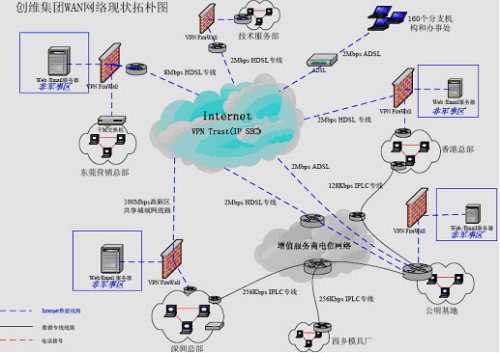 ·整個(gè)網(wǎng)絡(luò)連通性很差:隨著公司業(yè)務(wù)發(fā)展和規(guī)模擴(kuò)大,現(xiàn)在整個(gè)集團(tuán)除總部外還包括13個(gè)產(chǎn)業(yè)公司和全國(guó)160個(gè)分支機(jī)構(gòu),分布在以深圳為中心的全國(guó)各個(gè)地方,目前各產(chǎn)業(yè)公司之間的網(wǎng)絡(luò)連接除深圳總部、香港、公明基地和西鄉(xiāng)模具廠(chǎng)四地之間是通過(guò)窄帶IPLC專(zhuān)線(xiàn)連接外,其他各地均通過(guò)Internet公網(wǎng)連接,沒(méi)有構(gòu)成統(tǒng)一的企業(yè)內(nèi)部網(wǎng)絡(luò)互連。