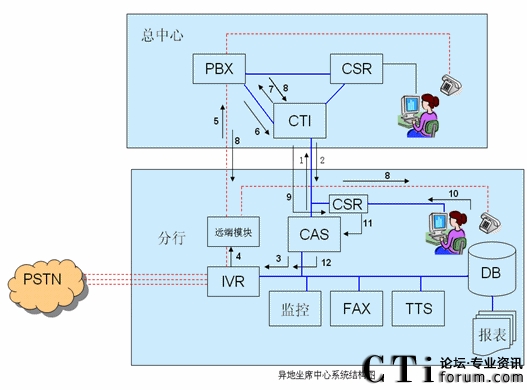 對(duì)于山東省分行連接總行呼叫中心北中心心的情況,農(nóng)業(yè)銀行對(duì)系統(tǒng)的總體結(jié)構(gòu)已經(jīng)做了比較詳細(xì)的規(guī)劃,異地坐席中心的系統(tǒng)結(jié)構(gòu)圖如下:
