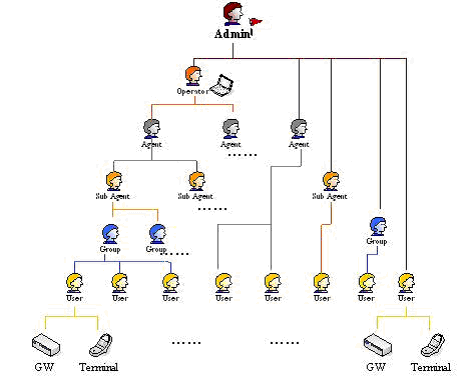 上圖體現(xiàn)了各級別之間的從屬關(guān)系。在后付系統(tǒng)中上級代理具有管理、查詢、開啟下級代理賬號和設(shè)備的權(quán)限;在預(yù)付系統(tǒng)中上級代理僅有管理、查詢、開啟下級代理帳號的權(quán)限,下級代理所屬設(shè)備只能由下級代理自身開啟。這樣的分級管理有利于各種商業(yè)模式的操作,并使系統(tǒng)有更大的擴(kuò)展性。
