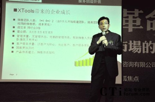 另外,濟(jì)南創(chuàng)弈工場(chǎng)總經(jīng)理趙小峰任曉峰與現(xiàn)場(chǎng)嘉賓分享了自身創(chuàng)業(yè)與成長過程。創(chuàng)弈工場(chǎng)科技有限公司成立于2008年,是由山東大學(xué)創(chuàng)業(yè)團(tuán)隊(duì)發(fā)展而來的、以先進(jìn)電子商務(wù)架構(gòu)和企業(yè)CI設(shè)計(jì)專家為目標(biāo)的公司。趙總?cè)慰偸且晃?0后互聯(lián)網(wǎng)新銳,他表示:“公司運(yùn)用XTools具有管理思想的系統(tǒng)幫助管理這支年輕的隊(duì)伍,使其健康發(fā)展,對(duì)于創(chuàng)業(yè)者來說,銷售體系的管理是至關(guān)重要的,這樣我們少走了彎路!