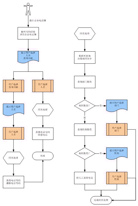 當(dāng)電話簿記錄中出現(xiàn)同名時(shí),可以定義同名的區(qū)分條件,如不同部門(mén),不同性別等。在語(yǔ)音識(shí)別時(shí),根據(jù)區(qū)分條件提示主叫選擇。