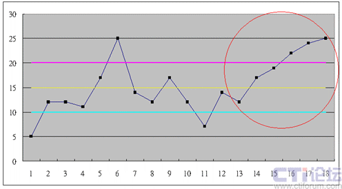 12就是數(shù)據(jù)有12個(gè)點(diǎn),像是鋸齒一樣,在均值上下連續(xù)跳動(dòng)(六西格瑪用到了14個(gè)點(diǎn),我認(rèn)為呼叫中心觀察到12個(gè)點(diǎn)就應(yīng)該可以確認(rèn)有特殊原因了)。