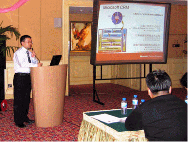 微軟公司負(fù)責(zé)天津地區(qū)的夏玉玲小姐在簡(jiǎn)短的開幕式后首先發(fā)表演講,介紹了微軟為商業(yè)應(yīng)用開發(fā)的各種商務(wù)解決方案(MBS)。其后通用咨詢公司總經(jīng)理鄭明先生上臺(tái)演說(shuō),其演講主題將營(yíng)銷管理理論體系與微軟CRM密切結(jié)合,博得了與會(huì)者贊同的掌聲。