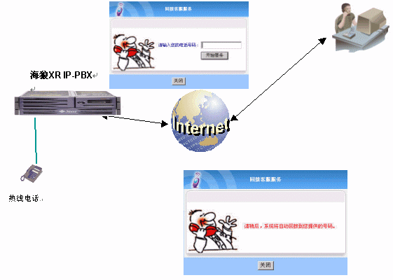 如圖:用戶(hù)在上網(wǎng)訪(fǎng)問(wèn)企業(yè)網(wǎng)站的時(shí)候,如果需要和企業(yè)進(jìn)行聯(lián)系,手邊沒(méi)有麥克風(fēng),就可以使用企業(yè)在網(wǎng)頁(yè)上的CALL-BACK800鏈接,點(diǎn)擊后就彈出一個(gè)窗口,然后輸入身邊的座機(jī)或者手機(jī)號(hào)碼,點(diǎn)擊開(kāi)始服務(wù),窗口出現(xiàn)紅色的"請(qǐng)稍候,系統(tǒng)將自動(dòng)回?fù)艿侥峁┑奶?hào)碼" ,稍等一會(huì)后,用戶(hù)的電話(huà)就會(huì)被呼叫,接通后就可以和企業(yè)的熱線(xiàn)電話(huà)進(jìn)行溝通。可以實(shí)現(xiàn)和WEB800同樣的效果,但是CALL-BACK800相對(duì)用戶(hù)來(lái)說(shuō)是一個(gè)更方便的溝通方式。