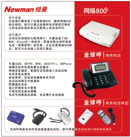 王先生是惠州某金屬材料國際貿易公司的外銷部主任。每天,王先生都要定期用Skype加耳麥和海外的銷售分公司及代理商進行語音溝通。一次在《電腦報》上看到全球呼智能商務電話的廣告后,王先生試著買了一臺,使用后客戶那端根本沒感覺到這邊的呼出設備是電話機。由于設備費用只有百來塊錢、音質還不錯,王先生干脆給手下負責南美洲、歐洲的外銷經理們,以及國外的合作伙伴都配了一臺。此后手下反映,用全球呼智能商務電話溝通比用耳麥方便多了,再也不用老是取取摘摘了——方便。同時,全球呼還可當普通電話機使用,F(xiàn)在,王先生正在給老板建議,是否增加一臺網(wǎng)絡800系統(tǒng)。因為最近的網(wǎng)上咨詢客戶比上月增加了不少,海外客戶打電話進來都偶有占線狀態(tài),效率略為降低。據(jù)紐曼公司的技術人員介紹,裝完網(wǎng)絡800后,只要有客戶呼入,有四個用戶可以接受被叫,占線的概率低了。同時企業(yè)由于擁有800,形象也大為提高。王先生甚至還覺得可以將800號碼嵌入到公司在阿里巴巴的頁面上,客戶就點擊800按鍵就可以直接連通銷售經理桌上的電話機了,也無需打開貿易通軟件。王先生覺得老板一定會采納他的建議。