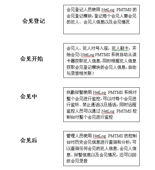 通過NetLog PMTMS系統(tǒng)的改善,整個會見流程變的高效和先進(jìn)。改善后的會見流程如下:
