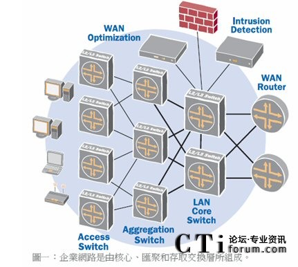 復(fù)雜的網(wǎng)絡(luò)拓?fù)?/b>:網(wǎng)絡(luò)架構(gòu)因內(nèi)含龐雜的多層網(wǎng)絡(luò),而變得越來越復(fù)雜。目前多數(shù)企業(yè)網(wǎng)絡(luò)都是三層式拓?fù),包括?shù)據(jù)匯聚層或分發(fā)層。許多網(wǎng)絡(luò)都已部署了匯聚交換機(jī),以彌補(bǔ)傳統(tǒng)存取及核心交換機(jī)欠缺高速光纖接口的缺陷,以便支持直接的連接。有些企業(yè)甚至建立了第四層網(wǎng)絡(luò),由連接到核心交換機(jī)的核心路由器組成。這樣的網(wǎng)絡(luò)架構(gòu)雖然可以發(fā)揮一定的作用,但卻大幅增加了資本支出,造成操作流程過于復(fù)雜,并為管理帶來沉重負(fù)擔(dān)。此外,這類架構(gòu)也會增加網(wǎng)絡(luò)的等待時(shí)間,并導(dǎo)致超額負(fù)載的情況出現(xiàn),因而降低了應(yīng)用效能。