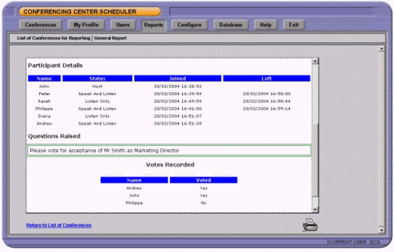 管理員可以生成會議使用率和每個會議的報告。消息內(nèi)容包括會議名稱,ID號,會議起始日期,會議持續(xù)時間和與會人員的數(shù)目。每個會議報告可以列出與會人員的詳細列表和他們何時進入/離開會議。