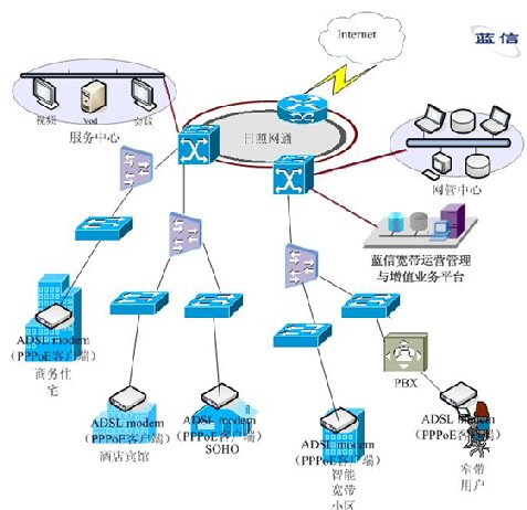 在以以太網(wǎng)技術(shù)為主建設(shè)的運(yùn)營區(qū)域,在中心由一臺模塊化的核心交換機(jī)支持,輔以多臺BASE設(shè)備連接,在接入層用交換機(jī)做接入設(shè)備,保證用戶數(shù)據(jù)的快速傳播。在網(wǎng)絡(luò)核心處,部署信利公司的藍(lán)信寬帶認(rèn)證計費(fèi)系統(tǒng),負(fù)責(zé)對全網(wǎng)用戶的安全認(rèn)證、計費(fèi)及管理。藍(lán)信寬帶認(rèn)證計費(fèi)系統(tǒng)除支持標(biāo)準(zhǔn)的RADIUS協(xié)議外,還支持PPPoE、802.1x認(rèn)證。在用戶終端處,部署藍(lán)信特制的PPPoE客戶端,實現(xiàn)撥號上網(wǎng)。
