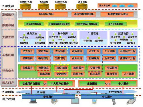 功能上分為企業(yè)門戶與個(gè)人門戶。企業(yè)門戶可以通過話務(wù)員服務(wù)以及企業(yè)網(wǎng)上自服務(wù)提供號(hào)碼百事通的業(yè)務(wù)受理等功能;個(gè)人門戶同樣可以通過話務(wù)員及個(gè)人網(wǎng)上自服務(wù)功能提供號(hào)碼百事通所有的業(yè)務(wù)。