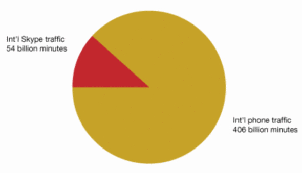 數(shù)據(jù)顯示,2009年全球國際長(zhǎng)途電話通話時(shí)長(zhǎng)為4060億分鐘,其中Skype至Skype的通話時(shí)長(zhǎng)為540億分鐘。TeleGeography表示,過去25年,通過電話機(jī)的國際長(zhǎng)途電話通話量年增長(zhǎng)率為15%,但過去幾年中這一增長(zhǎng)率有所下降。過去兩年,這類國際長(zhǎng)途電話通話量每年增長(zhǎng)率僅為8%。