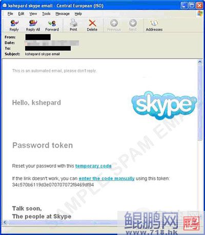 訊息中的連結雖然已經(jīng)關閉了,但一如預料地并不會進入到合法的Skype網(wǎng)頁。
