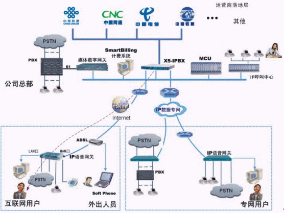 - 中心的X5-IPBX系統(tǒng)可以服務(wù)于互聯(lián)網(wǎng)用戶(hù)和企業(yè)內(nèi)部數(shù)據(jù)專(zhuān)網(wǎng)用戶(hù),實(shí)現(xiàn)雙網(wǎng)匯接,使得不同網(wǎng)絡(luò)中的用戶(hù)可以實(shí)現(xiàn)IP電話通信。