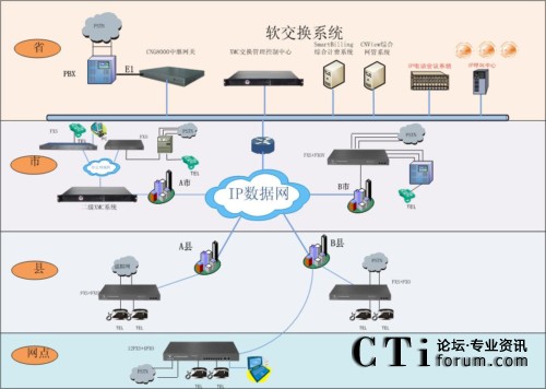 - 地州市分集團放置的二級軟交換系統,作為其管轄的縣(市)級分集團和營業(yè)廳的呼叫控制中心,管理和控制其管轄地區(qū)的IP電話終端設備。