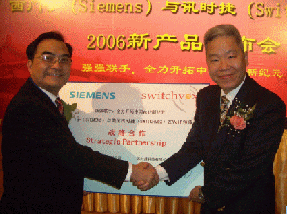 2006年3月29日的北京,還有些春風料峭,但北京長富宮的芙蓉廳卻是暖意融融,德國通訊業(yè)巨擘西門子(Siemens)和美國企業(yè)通訊業(yè)新寵訊時捷(Switchvox)聯合舉辦VoIP新產品發(fā)布會,西門子終端通訊設備(上海)有限公司CEO