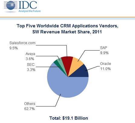 根據IDC的調查數據顯示,目前就CRM市場來說,Salesforce和SAP正呈現(xiàn)出一種超越甲骨文,奪取領頭羊寶座的趨勢。