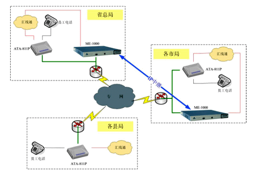 由于用戶數(shù)量較大,我們建議采取分級管理方式,利用我們Anta科技(北京)有限公司Simplicity 系列IP-PBX產(chǎn)品的靈活性,在每個市局放置一臺ME-1000型號的IP-PBX,管理市局及下屬縣區(qū)局的電話系統(tǒng);省總局放置一臺ME-1000,管理總局電話系統(tǒng);同時各市局的ME-1000向總局注冊,形成IP中繼連接,組成全省互通的IP電話管理系統(tǒng)。在終端方面,我們建議采用單端口的ATA-811P桌面型語音網(wǎng)關(guān)連接話機(jī),該網(wǎng)關(guān)通過向IP-PBX注冊,將所有模擬話機(jī)連接到VOIP系統(tǒng)中來。