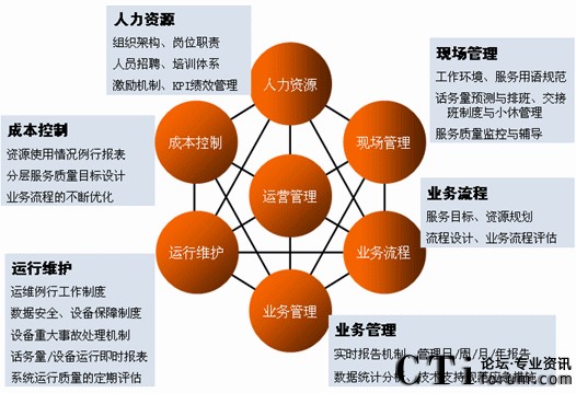 一般來講,呼叫中心的運營管理由人力資源、現(xiàn)場管理、成本控制、運行維護(hù)、業(yè)務(wù)管理、業(yè)務(wù)流程六種要素組成。這六者之間的關(guān)系正如下圖所示:
