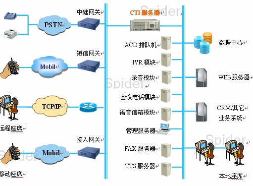 隨著呼叫中心相關(guān)技術(shù)的發(fā)展,呼叫中心的功能日益豐富,其組成結(jié)構(gòu)也日益復雜。一個完整的呼叫中心可以認為由基本部分和擴展部分兩部分組成。呼叫中心的基本組成部分為:自動呼叫分配模塊(ACD)、IVR交互式語音應答系統(tǒng)、CTI服務器、錄音、人工座席、班長席、后臺管理系統(tǒng)等;擴展模塊包括FAX服務器、web服務器、email服務器及語音信箱、會議電話等功能。