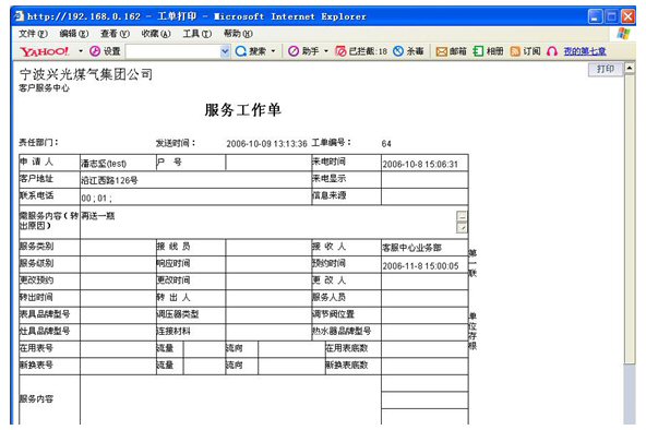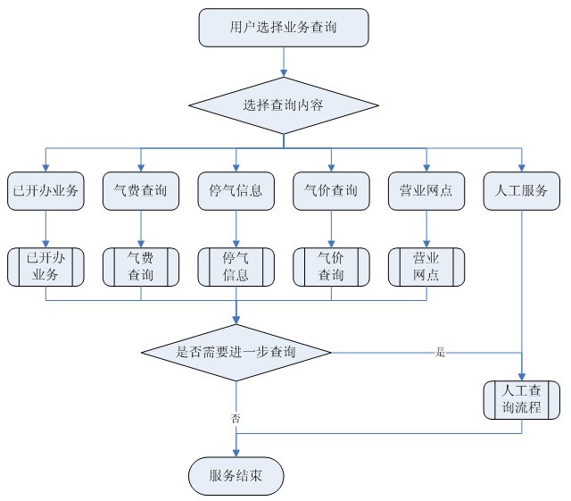 業(yè)務(wù)查詢:用戶可通過受理人員或自動語音應(yīng)答系統(tǒng)根據(jù)用戶要求從數(shù)據(jù)庫查詢資料,然后通過語音方式播報或送到用戶指定傳真機或其他終端設(shè)備上。應(yīng)考慮以后用web方式查詢氣費等數(shù)據(jù),以不動及主體設(shè)備方式平滑升級。