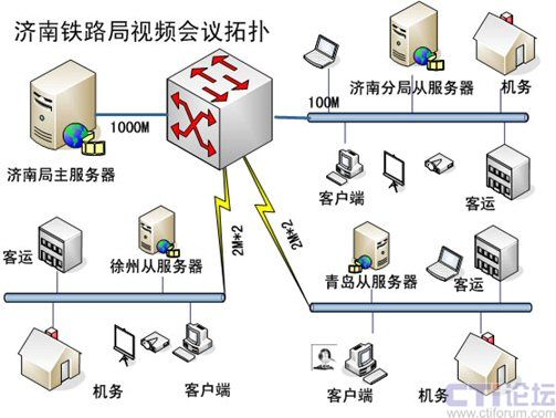 由于路局改革后組織結(jié)構(gòu)的特點,決定了跨地域會議較多,如濟(jì)南和徐州、青島之間召開的部門級別的會議比較頻繁,加上三地之間的帶寬制約,本方案建議采用主從服務(wù)器的系統(tǒng)架構(gòu),1主3從,主服務(wù)器設(shè)置在路局網(wǎng)絡(luò)中心,原來濟(jì)南分局位置設(shè)置1臺從服務(wù)器,負(fù)責(zé)濟(jì)南地區(qū)的內(nèi)部會議,以及與其他2地的遠(yuǎn)程會議,同樣徐州、青島也各設(shè)置1臺從服務(wù)器。