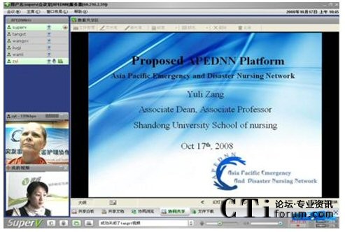 視維視頻會議系統(tǒng)良好的兼容性,使亞太地區(qū)各成員國的代表雖遠隔千山萬水,依然可以實現(xiàn)無限溝通。視維視頻會議系統(tǒng)所提供的清晰流暢的音視頻使各成員國的代表無需走出國門,無需聚到一起,就可以輕松地網(wǎng)絡面對面的進行交流,既可節(jié)約差旅費用,又可避免舟車勞頓之苦,是各國代表有更多精力投入到工作中;視維的共享白板、共享文檔、文件下載等強大的數(shù)據(jù)協(xié)作功能可以使各國代表快速地共享更多的信息、資料,及時地開展越洋培訓。近日網(wǎng)絡面對面地討論第三屆APEDNN的進程及各項議題就是一次典型的應用之一,不僅節(jié)約了差旅和時間成本,而且提高了工作效率,拉近世衛(wèi)各成員國之間的距離,天涯若比鄰,是各國代表在工作上更為默契,提高人類應對突發(fā)事件與災害的能力。