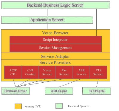 聲通技術(shù)的Amany IVR是集流程編輯環(huán)境、語法解析器和執(zhí)行平臺(tái)為一體的通用語音平臺(tái),在這基礎(chǔ)上增加了CTI中間件和TAPI/WAV等方面的技術(shù)支持,使它不僅能作為一個(gè)獨(dú)立的語音應(yīng)答系統(tǒng)使用,而且可以作為呼叫中心理想的IVR服務(wù)器,并且可以作為外撥服務(wù)器、傳真服務(wù)器、語音門戶網(wǎng)站系統(tǒng)使用,是一個(gè)具有國際先進(jìn)水平的綜合性語音平臺(tái);所有的可選功能模塊通過獨(dú)有的Plug-in技術(shù)可實(shí)現(xiàn)功能模塊動(dòng)態(tài)卸載,使客戶可以挑選自己需要的功能模塊,在將來需要的時(shí)候在配置相應(yīng)的功能模塊,使客戶成本大大降低,同可以保證將來系統(tǒng)平滑升級(jí),使用擁有更多的選擇。