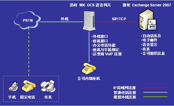 迅時(shí)通信針對(duì)微軟統(tǒng)一溝通解決方案,在2008年推出了MX-OCS系列辦公型VoIP語音網(wǎng)關(guān)。將微軟Exchange Server 2007 統(tǒng)一消息服務(wù)器與迅時(shí)通信MX-OCS網(wǎng)關(guān)集成而構(gòu)成的解決方案(簡(jiǎn)稱“1+1”方案),能大幅降低中小企業(yè)擁有統(tǒng)一溝通平臺(tái)的成本。