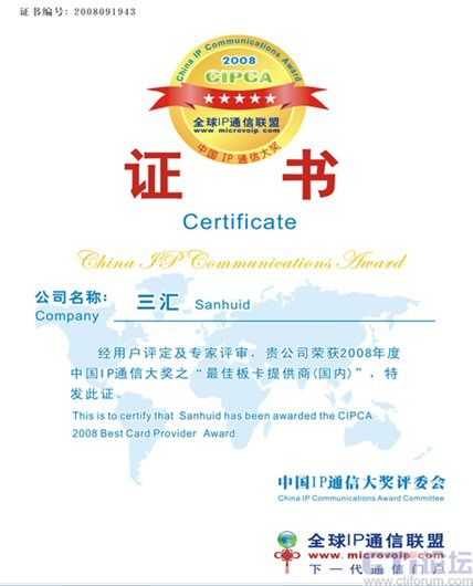杭州三匯榮獲CIPCA 2008中國(guó)IP通信大獎(jiǎng)