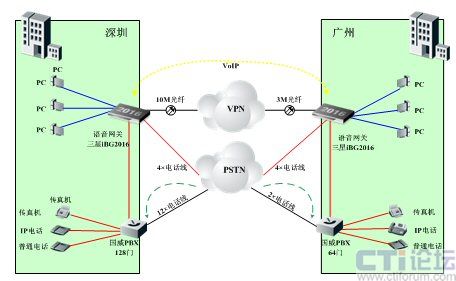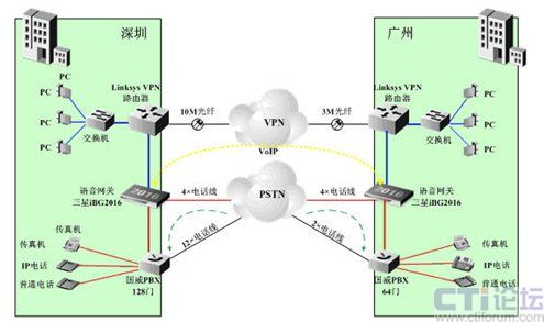 A公司總部設(shè)在深圳,在廣州有分公司。深圳總部目前已有10M光纖到樓作為總出口帶寬,已安裝1臺(tái)支持VPN功能的Linksys路由器;語音方面,已申請(qǐng)了16條電話線,并安裝1臺(tái)國威128門PBX;廣州也引入了3M光纖作為出口帶寬,和6條電話線作為PSTN外線,已安裝1臺(tái)支持VPN功能的Linksys路由器和1臺(tái)國威64門PBX。深圳、廣州兩地公司已建立了VPN隧道,以提供有安全保障的數(shù)據(jù)網(wǎng)絡(luò)平臺(tái)。