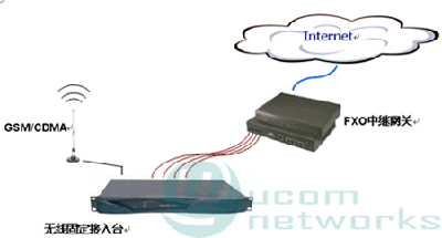 本方案采用FXO中繼語音網(wǎng)關(guān)接入互聯(lián)網(wǎng),由當?shù)仄胀M電話線路落地對接網(wǎng)關(guān)FXO口,采用電話卡綁定網(wǎng)關(guān)預(yù)付費計費實現(xiàn)運營。落地線路接入可以使用本地固定PSTN線路,也可以轉(zhuǎn)制無線電話,采用固定臺接入,2種拓撲圖如下所示。