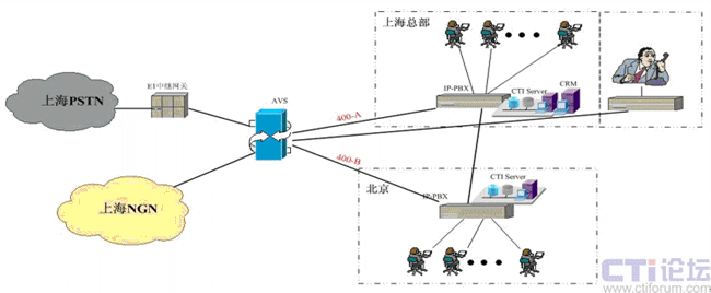 在上海采用傲威通信的AVS軟交換平臺實現(xiàn)VoIP呼叫系統(tǒng)的主叫識別,決定呼叫路由的選定。在上海和北京分別建設(shè)IP-PBX和CTI呼叫系統(tǒng),在各辦事處或分公司可根據(jù)選擇是否要建設(shè)坐席或普通電話系統(tǒng),所有節(jié)點的呼入呼出統(tǒng)一從上海出口實現(xiàn)出入。