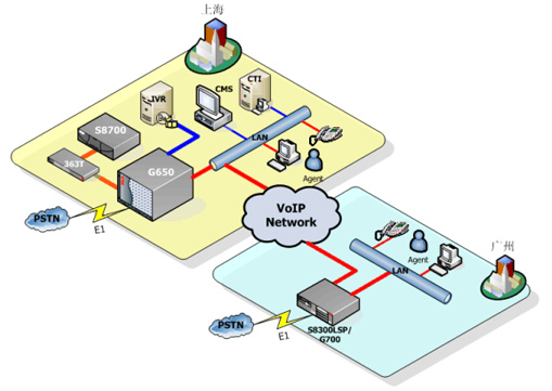 為了進一步拓展中國市場,并且針對某些特定的地方需要提供本地化方言服務(wù),S公司需要在廣州設(shè)立一個新的座席集群,座席數(shù)量在50左右,需要擁有與中心點一樣完善的功能,實現(xiàn)呼叫的自由分配,共享中心點設(shè)施,比如CMS(呼叫中心報表系統(tǒng))、IVR(交互式語音應(yīng)答系統(tǒng))和CDR(呼叫詳細記錄)等等。并提供最強的穩(wěn)定性和冗余備份功能。