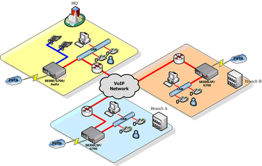 各地之間通過H.323 IP Trunk將彼此連接在一起。G700媒體網(wǎng)關(guān)提供了強大的VoIP DSP,一個媒體網(wǎng)關(guān)在不增加VoIP資源卡 (MM760)的情況下,以同時支持64路G.711壓縮標(biāo)準的語音通信。