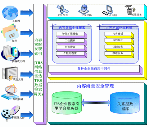 TRS公司推出的企業(yè)搜索引擎解決方案,利用TRS公司多年來(lái)自主開發(fā)的TRS Database Server作為企業(yè)搜索引擎服務(wù)的平臺(tái)。可以將電信企業(yè)內(nèi)外部多種格式、多種介質(zhì)形態(tài)、多種存儲(chǔ)方式的內(nèi)容信息,以實(shí)時(shí)的方式將這些信息進(jìn)行索引。并且在索引的過(guò)程中力求能夠做到準(zhǔn)確,并配合以相關(guān)智能語(yǔ)言技術(shù)做信息的去重、自動(dòng)標(biāo)引等能力。其框架如圖: