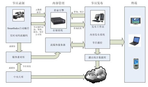 節(jié)目制作平臺主要負(fù)責(zé)節(jié)目的采編,接收節(jié)目源的數(shù)字視頻信號和模擬視頻信號進(jìn)行實(shí)時/超實(shí)時的轉(zhuǎn)碼,并同時進(jìn)行自動編目、歸檔,滿足系統(tǒng)不同應(yīng)用的要求。另外,各資源建設(shè)成員單位或各地、州、市遠(yuǎn)程辦按照省遠(yuǎn)程辦的統(tǒng)一部署,加工各自類別的課件,采用人工傳送介質(zhì)或利用VPN實(shí)現(xiàn)專網(wǎng)的方式送交到資源庫系統(tǒng)中,實(shí)施統(tǒng)一的存儲和管理。