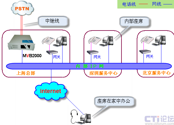 在技術(shù)上,MVB2000 的語(yǔ)音業(yè)務(wù)通過(guò)電信運(yùn)營(yíng)商的模擬或者數(shù)字中繼線(xiàn)路接入,數(shù)據(jù)業(yè)務(wù)都通過(guò)局域網(wǎng)或者互聯(lián)網(wǎng)使用TCP/IP協(xié)議傳送,解決了呼叫中心中大量數(shù)據(jù)傳送的需求,請(qǐng)看下面的網(wǎng)絡(luò)組織結(jié)構(gòu)圖: