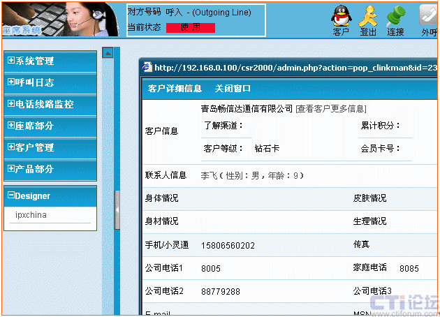 當(dāng)客戶(hù)來(lái)電轉(zhuǎn)接人工服務(wù)時(shí),自動(dòng)彈出信息登記窗口并根據(jù)來(lái)電號(hào)碼檢查客戶(hù)資料庫(kù)中是否有該客戶(hù)的數(shù)據(jù)。如客戶(hù)的名稱(chēng)、地址、聯(lián)系電話(huà)、身體狀況、膚色、以往的咨詢(xún)、投訴等記錄信息。以及來(lái)電日期、時(shí)間、受理人等;使座席人員一目了然,第一時(shí)間了解來(lái)電的相關(guān)信息。