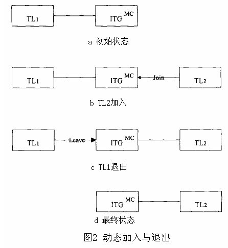 hoc多點(diǎn)會(huì)議的動(dòng)態(tài)加入與退出是等價(jià)的。圖3(a)說明了ITG與TL1通信時(shí)的漫游。圖2(b)說明了子網(wǎng)1向子網(wǎng)2的移交處理。圖2(c)說明了在移交處理結(jié)束后ITG與TL1連接的中斷。最后,移交處理成功完成,只剩下ITG與TL2的連接,如圖2(d)所示。
