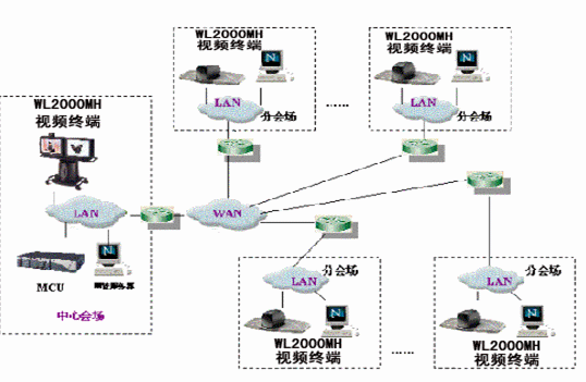各個節(jié)點(diǎn)上的會議室型WL-2000MH終端的數(shù)據(jù)流可向多點(diǎn)控制器MCU發(fā)送動態(tài)高清晰度圖像(720*576的FULL D1), 可以把主會場攝象機(jī)畫面清晰地傳輸?shù)剿蠾L-2000MH終端。