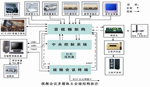 根據(jù)貴單位的分布特點(diǎn),視頻會議會議系統(tǒng)建立7個會場,其中主會場一個,設(shè)在大樓的會議室,分會場6個,設(shè)在各下屬單位會議室。傳輸信道采用系統(tǒng)內(nèi)部的寬帶IP綜合網(wǎng)絡(luò)。
