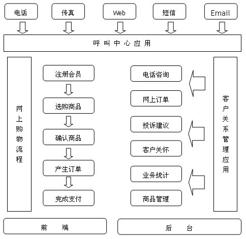 依照我公司的建設(shè)方向,中小型網(wǎng)上購物平臺的客戶服務(wù)呼叫中心系統(tǒng)應具備呼叫中心的基本功能,同時融入了網(wǎng)上購物的客戶關(guān)系管理(CRM)流程,因此,它是呼叫中心與CRM系統(tǒng)的有機結(jié)合體,包含電話咨詢、網(wǎng)上訂單、客戶關(guān)懷等主要功能層的應用。