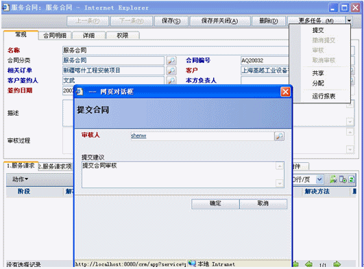 服務(wù)合同是也分為兩種,一種是非公司項目的服務(wù)請求此時沒有與訂單關(guān)聯(lián);二種是公司項目后服務(wù)請求,此時可以關(guān)聯(lián)訂單也可以不關(guān)聯(lián)訂單,如果關(guān)聯(lián)訂單就可以將訂單產(chǎn)品明細(xì)導(dǎo)入合同明細(xì)中(導(dǎo)入明細(xì)是可以調(diào)整數(shù)量和價格的).