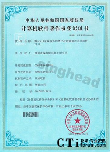 CTI論壇(ctiforum)5月19日消息(記者 楊佳林):2010年4月27日,深圳市深海捷科技有限公司申請的《Mixcall家政服務(wù)網(wǎng)絡(luò)中心運營管理系統(tǒng)軟件V1.0》著作登記獲得國家版權(quán)局審核并通過。