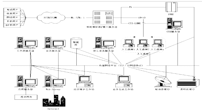客戶服務(wù)中心充分利用CTI技術(shù)使企業(yè)的業(yè)務(wù)系統(tǒng)最大限度地與用戶建立聯(lián)系,共享用戶的需求等信息資源,從而能夠最大限度的為用戶服務(wù)。簡單地說,客戶服務(wù)中心系統(tǒng)是一個工作組,這個工作組由若干成員組成,這些成員既包括普通的人工座席,也包括一些自動語音設(shè)備、語音信箱等。這些成員通過網(wǎng)絡(luò)實現(xiàn)相互間的通信,并共享網(wǎng)絡(luò)上的資源,并實現(xiàn)與業(yè)務(wù)系統(tǒng)及辦公自動化系統(tǒng)的互聯(lián)。早期的客戶服務(wù)中心系統(tǒng)包括114服務(wù),用戶撥打當(dāng)?shù)仉娦欧⻊?wù)商的"114",呼叫首先被放到ACD(Automatic